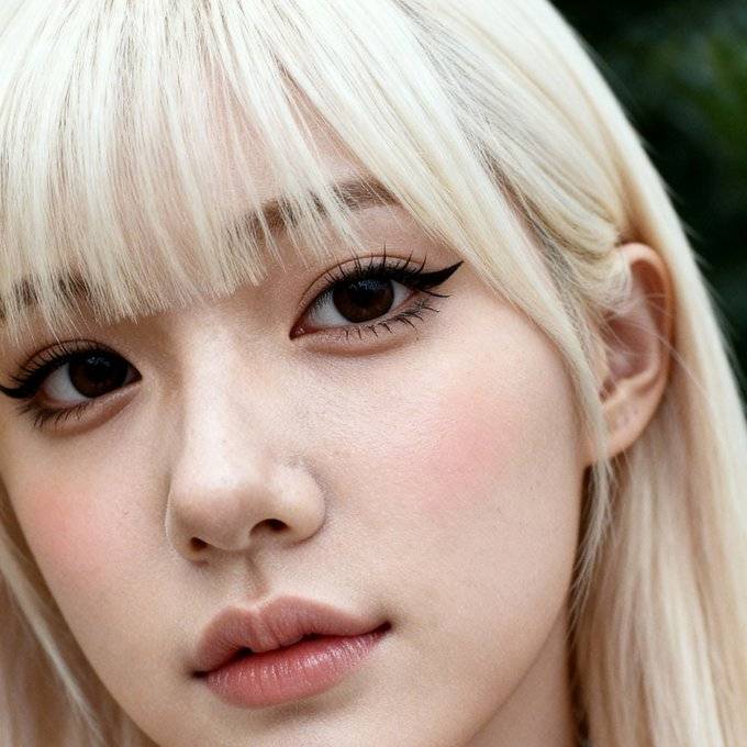 请将第一张图片的角色放大到第二张图片的分辨率高度,并拉近镜头,直至能清晰看到皮肤质感。