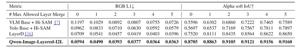 定量比较:在Crello数据集上的“图像转多层RGBA”任务中,Qwen-Image-Layered在RGB重建误差和Alpha通道预测精度(Alpha soft IoU)上均达到最佳。 表1:在Crello数据集上的定量对比